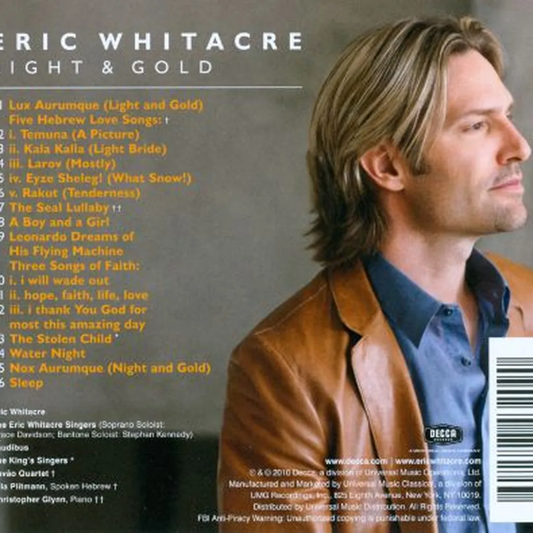 Light and Gold is an album by American composer Eric Whitacre, released in 2012. Musically the release is rooted in choral and contemporary classical styles and has dense vocal harmonies with orchestral textures; it followed his established reputation in choral composition and broadened his recorded work into larger ensemble settings.